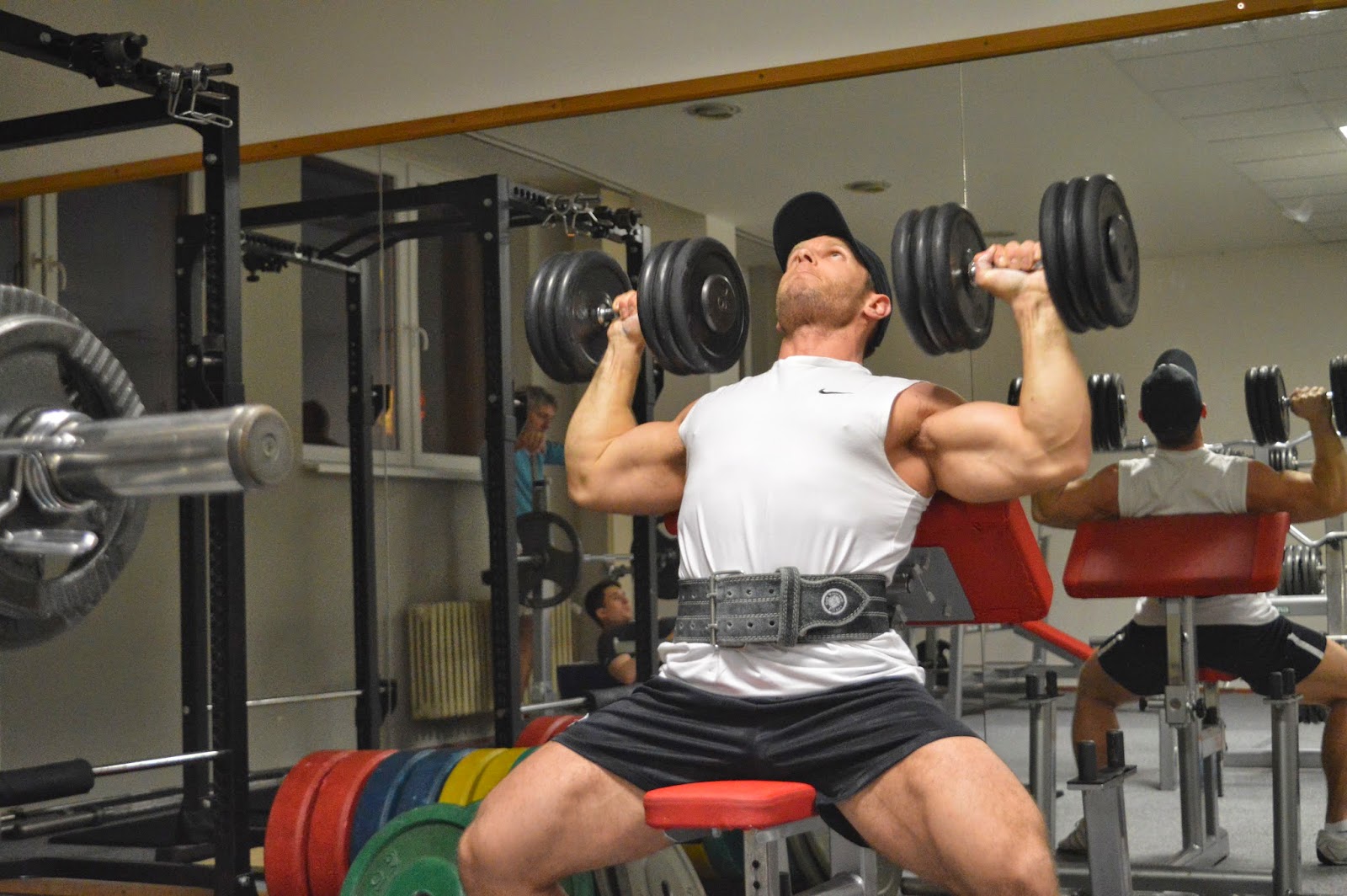 Seated DB press 2x warm up sets; 10r 32,5kg 6,8r 35kg
